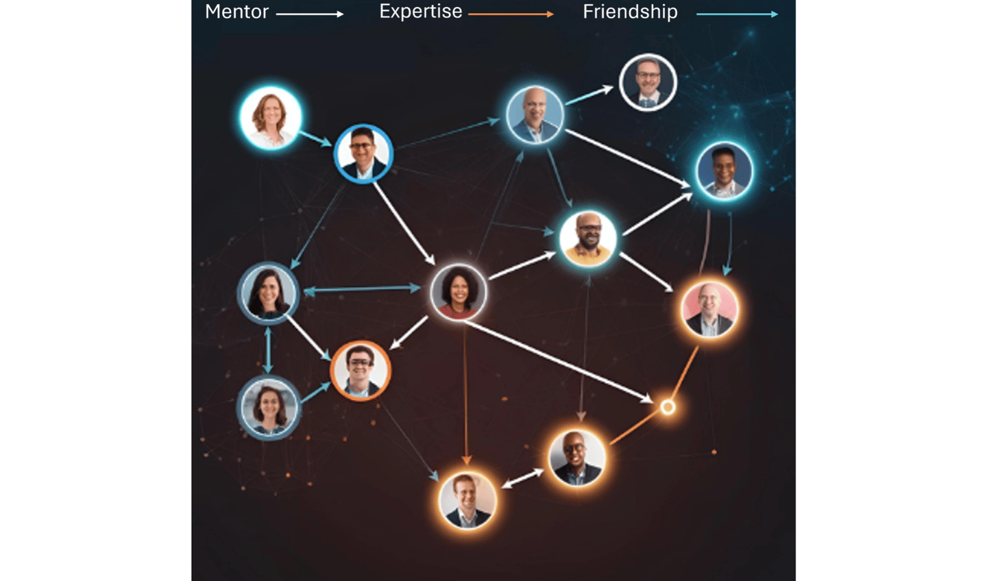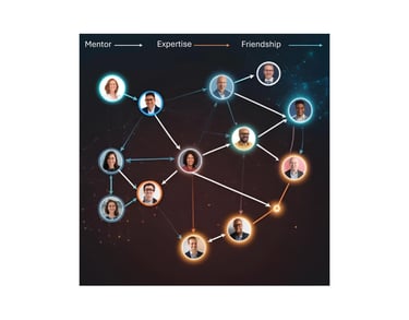 A more advanced concept within networking is the concept of influence maps or influence networks where you map out people in your network indicating the strength of their relationships or connections and the mode or nature of the influence they have on each other. Then using this map, you can develop strategies on how to expand your network. For example, in the graphic below connections are indicated by an arrow. A one-way arrow means the individual has direct influence on the other person and a two-way arrow means they can influence each other. The strength of the relationship or influence is indicated by the strength of the arrow and the colour denotes what is the nature of the influence or relationship - in this case it illustrates if the relationship is based on a mentoring, frriendship or expertise basis.